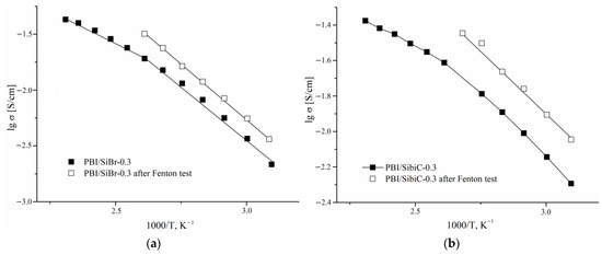 Conductivity temperature dependence for membrane samples after testing under oxidizing conditions with Fenton’s reagent. SiBr (a), SibiC (b) and KH 560 (c) were used as crosslinking reagents. For comparison, the data of samples not treated with Fenton’s reagent are given.
