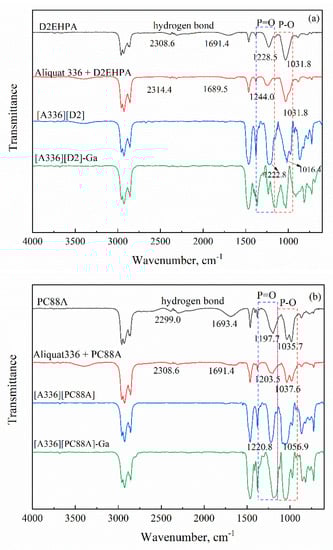 The structures of the prepared extractants and the coordination properties of the complexes formed during the extraction process were further determined by FTIR spectroscopy. Figure 5 presents the FTIR spectra of the organic phase containing individual acidic extractants, binary mixtures and Bif-ILs before and after extracting Ga(III). The spectra show that the intensity of stretching vibration of P=O and P-O bonds increased in the Bif-ILs compared to those in individual acidic extractants. Furthermore, the dimeric peaks of hydrogen bands between acidic extractants molecules at around 1690 cm−1 and P-OH vibration at around 2310 cm−1 disappeared in Bif-ILs, which indicates that hydrogen bonds in the BIf-ILs were completely removed [30]. All of these changes in the characteristic bands in the main types of functional groups of acidic extractants, namely, P=O, P-O, P-O-H and hydrogen bonds, verified the strong ionic interaction between the anions of the acidic extractants and the cations of Aliquat336 in Bif-ILs [27]. A partial shift of the P=O and P-O bands was observed in the Bif-ILs after extracting Ga(III), and was attributed to the conversion of the free ligands to the Ga(III)-ligand complex in the organic phase, indicating that the O atom in the P=O or P-O bond may have interacted with Ga(III) in the aqueous phase.