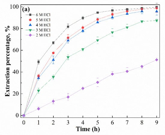 It is widely accepted that the acidity levels of both feed and stripping solutions are of great influence in facilitated transport processes using supported liquid membranes [31]. The influence of the initial HCl concentration in the feed solution on the transport of Ga(III) with an SLM containing [R4NCy] was assessed, and results are shown in Figure 6. The results show that the extraction percentage elevated sharply from 51.2% to 95.8% as the HCl concentration increased from 2 to 4 M, while the extraction percentage increased smoothly from 98.5% to 99.7% as the HCl concentration increased from 4 to 6 M. Similarly, the permeability coefficient increased from 1.47 to 7.20 μm s−1 and from 7.20 to 10.8 μm s−1, as the HCl concentration increased. This means that the transport of Ga(III) was accomplished by the interaction between the Bif-ILs and the anionic complex GaCl4− formed in high hydrochloride acid solutions at the membrane/feed interface.