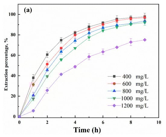 The influence of the initial Ga(III) concentration in the feed solution on the SLM transport efficiency was also studied, using feed solutions containing different Ga(III) concentrations ranging from 400 mg/L to 1200 mg/L. It can be seen from Figure 7 that the extraction percentage decreased from 97.8% to 75.1% when the Ga(III) concentration increased from 400 mg/L to 1200 mg/L. The permeability coefficient was decreased from 10.8 to 3.03 μm s−1 with the increase in the initial concentration. This was probably caused by the membrane saturation in the presence of a high concentration of metal ion, which lowers the available carriers for the interaction with Ga(III). Therefore, a feed solution containing 400 mg/L Ga(III) was selected for optimization of other experimental parameters.