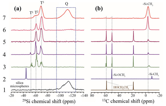 High-resolution 29Si NMR (a) and 13C NMR (b) spectra for tracking the evolution of MTMS precursors and the formation of MSL. The label 1–7 denotes the precursor, solvent, or the products generated at each step of the sol-gel reaction: 1. silica microsphere (a) or ethanol (b); 2. methyltrimethoxysilane; 3. mixture A in Section 2.2; 4. mixture B in Section 2.2; 5. mixture C in Section 2.2; 6. mixture E in Section 2.2, after drying; 7. sample 6 after sintering at 300 °C for 2 h.