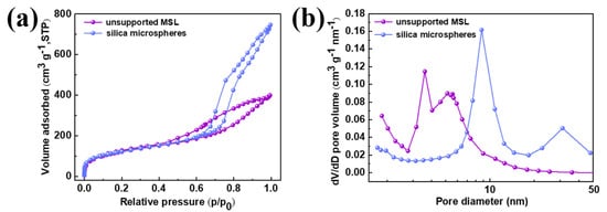 N2 adsorption-desorption isotherms (a) and pore size distribution (b) of the silica microspheres and unsupported MSL.