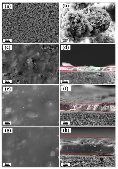 Scanning electron microscopy (SEM) surface morphology of α-Al2O3 ceramic membranes (a), grinded unsupported MSL (b), surface morphology of MSL-5 (c), MSL-10 (e) and MSL-15 (g). SEM cross-sectional morphology of MSL-5 (d), MSL-10 (f) and MSL-15 (h).