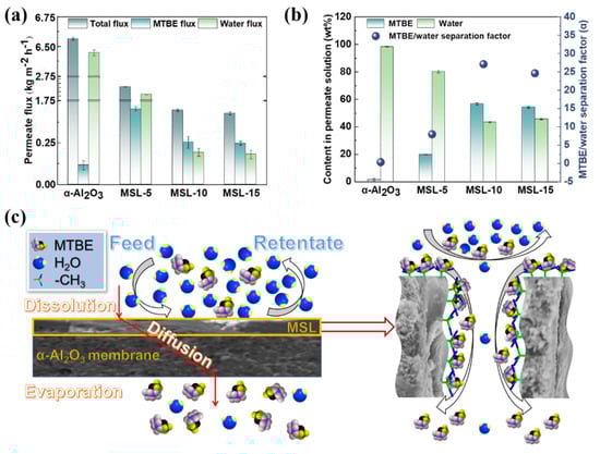 MTBE/water separation performance for the pristine and MSL deposited α-Al2O3 membranes. Permeate flux (a); content in the permeate and separation factor (b). Proposed mechanism for the MTBE/water separation by MSL-deposited α-Al2O3 ceramic membrane (c).