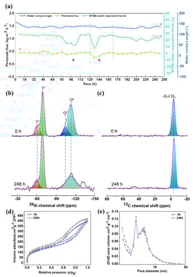 Long-term stability of the MSL-10 membrane operating under the operating conditions as follows: a feed temperature of 30 °C, an MTBE concentration of 4.6 wt%, and a feed flow rate of 200 mL min−1, except for the F and C regions, where region F indicates that the measurement is conducted by varying the feed flow rate and region C represents the variation of the MTBE content in feed solution (a). Solid state 29Si MAS (b) and 13C MAS (c) NMR spectra, N2 adsorption-desorption isotherms (d), and pore size distribution (e) of the unsupported MSL after exposure to the MTBE aqueous solution for different times.