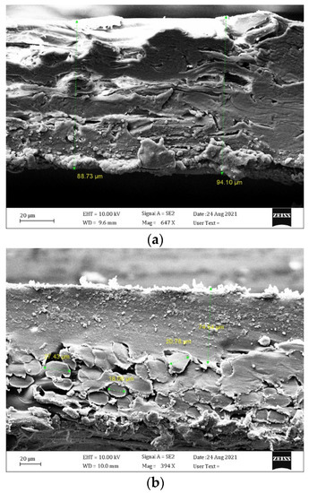 A Sigma VP FESEM microscope (Zeiss, Munich, Germany) was used to acquire FESEM images of the cross-section of these membranes. The microscopic diagrams in Figure 3 show the asymmetric texture of P-MEM and C-MEM, both with porous mechanical support on the underside. C-MEM has a fragile smooth surface of PEBAX polymer on the top cover. PEBAX is applied as a non-porous, hydrophilic, dense layer on top of the base layers. P-MEM also has a PES coating layer on the base. In contrast, kraft paper has a symmetrical porous texture.