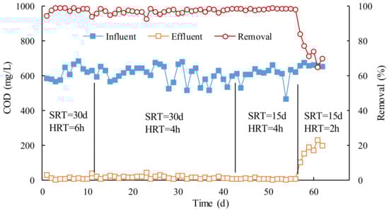 The average COD removal efficiency was 97.6% when SRT was 30 d and HRT was 6 h, while HRT was 4 h for 97.0%, indicating that the COD capacity in the MBR was sufficiently removed by active sludge with 4 h. We shortened SRT to 15 d and HRT to 4 h and 2 h, respectively, and continued to study the effects of SRT and HRT on the removal of COD. As can be seen from Figure 1, once HRT was reduced to 2 h, the effluent COD rapidly rose to more than 100 mg/L, and the COD removal efficiency fluctuated between 65% and 84%. The result shows that the MBR removal effect was significantly worse when HRT is 2 h, and HRT should be required to be at least 4 h. This is because HRT was too short to degrade COD by active sludge, that is, the sludge load exceeded the capacity of MBR. Therefore, it can be concluded that 4 h was the inferior limit of HRT, which could ensure MBR operates normally.