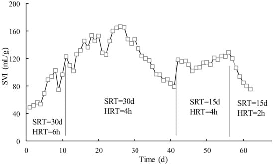 Figure 2 shows the variations of the sludge volume index (SVI) in the test, which was quite different from Figure 1. The SVI curve had a steady increase in the first stage (SRT = 30 d, HRT = 6 h) and early second stage (SRT = 30 d, HRT = 4 h) and then decreased in the later second stage. The SVI varies greatly in the first and second phases. It was basically stable in the third stage (SRT = 15 d, HRT = 4 h). Then, it decreased quickly in the fourth stage (SRT = 15 d, HRT = 2 h). An SVI below 200 mL/g indicates good settling characteristics of active sludge. In this test, the activated sludge of MBR showed good settleability.