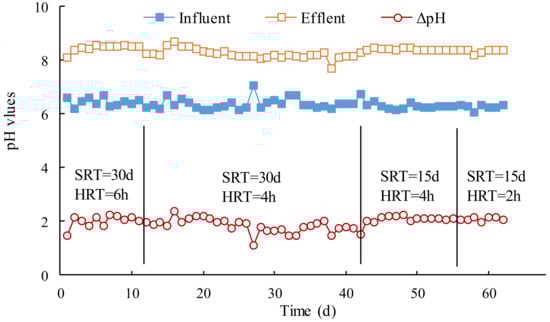 The variations of the pH values in the influent and effluent with different SRT and HRT are shown in Figure 3. All of the pH values were generally stable in the four stages of the operation. The pH values in the influent ranged from 6.06 to 6.76, and the corresponding pH values in the effluent ranged from 8.09 to 8.69.