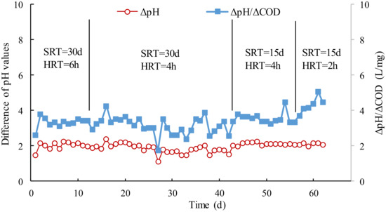 Effect of SRT and HRT on variation of pH values per unit COD (ΔpH/ΔCOD).
