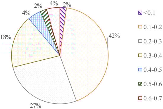 Figure 5 provides the turbidity in the effluent of MBR. All of the turbidities were less than 0.7 NTU, which means that the microfiltration module had a very strong separation on suspended solids in the mixed liquor of the reactor. Only 13% of the effluent turbidity was beyond 0.4 NTU, and 87% was less than 0.4 NTU. A total of 42% of the effluent turbidity ranged from 0.1 to 0.2 NTU, nearly a half of all the turbidity. A total of 27 and 18% of the turbidity was distributed in the ranges of 0.2–0.3 and 0.3–0.4, respectively. Even if the removal of COD greatly decreased in the final stage, the effluent turbidity was still stable; as a result, the effluent turbidity was not greatly affected by the operation parameters.