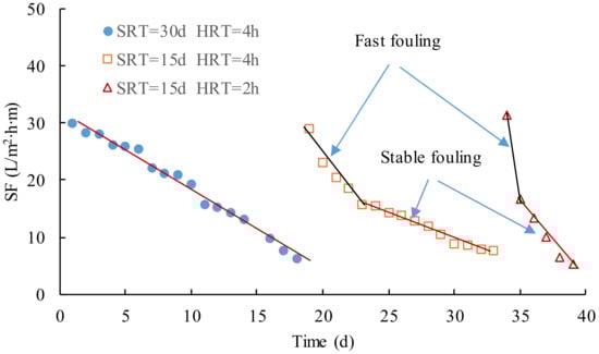 Figure 6 shows the variations of SF in the operation with the different SRT and HRT, which could be used to investigated membrane fouling rates in MBR. SF could be calculated using Equation (1). Variations of SF followed a similar trend that SF quickly decreased in the initial part and then gradually decreased with a stable decreasing rate in each stage, that is to say, the microfiltration membrane module had been seriously fouled at first, which was attributed to the formation and growth of the cake layer on the membrane surface. The cake layer attached to the membrane surface grew step by step, which was simultaneously erased from the membrane surface by aeration [,]. When the attachment on and erosion from the membrane surface reached the dynamic balance, the thickness of the cake layer would not greatly increase with the operation. The procedure could be explained using the separation mechanism of the microfiltration that included sieve, adsorption, and bridging []. At first, the activated sludge in the mixed liquor were cumulated near the membrane, blocked the pore, and attached on the surface, which reduced the effective filtration area and led to a fast fouling; therefore, three mechanisms were contributed to the initial fouling, and the fouling rate was the largest. After the cake layer formed, most of the contaminants were retained by the cake layer, and only small-sized particles could pass through and enter the membrane; thus adsorption and bridging were responsible for the stable fouling.