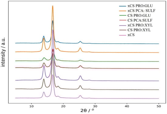 By looking at Figure 1, there is a significant variation (intensification of peak patterns) in the diffraction pattern of the DES-doped CS membranes compared with bare xCS. In particular, three DES-doped membranes (xCS PRO:XYL, CS PRO:XYL, xCS PCA:SULF) showed an increase in the peak intensities, suggesting that the crystallinity of CS membranes has been influenced by their addition. This could be explained by the fact that the incorporation of these DESs may, in certain cases, enhance intermolecular bonding between chitosan molecules, making the chains more rigid and restricting their movement. This, in turn, affects the crystallinity of the membranes, leading to an improvement in their elastic properties, such as elongation at break (see Figure 1). The addition of PRO:GLU was the only case where a significant lower peak intensity, with respect to xCS, was observed. In the cases of xCS, PRO:GLU, and CS PCA:SULF, no decrease in peak intensity and, therefore, in crystallinity was observed.