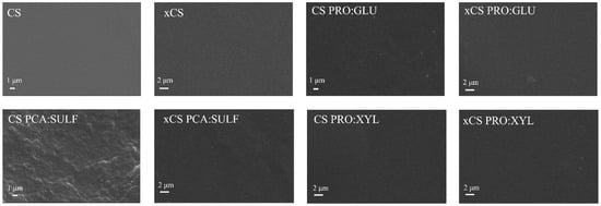 The surface morphologies of the prepared membranes are shown in Figure 2. All the membranes displayed a dense and compact surface, typical of membranes prepared by a solvent evaporation technique. The addition of DES into the CS matrix did not cause evident phase separation or an alteration of the surface morphology, which resulted in defect-free and uniform structures regardless of the DES employed. This result can be considered an indication of the proper dispersion and incorporation of the employed DES into CS membranes.