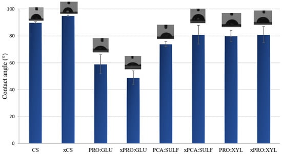 The results of the contact-angle measurements of the prepared membranes are presented in Figure 3. In particular, CS and xCS membranes presented contact values of 90° and 95°, respectively. The contact-angle values of CS-based membranes, reported in the literature, range from 74° to 90° [,] and are influenced by many factors such as the degree of acetylation, which generally foster the hydrophilicity of the membrane []. On the contrary, the DES-based membranes displayed lower contact-angle values and, hence, a superior hydrophilic moiety. In particular, the membranes prepared with the DES PRO:GLU presented the lowest contact angle (between 49 and 59°). Despite the hydrophobic nature of proline, glucose is in fact a polar molecule, bearing different hydroxyl groups able to attract polar molecules (like water and MeOH) to establish hydrogen bonds. For the membranes prepared with DES PRO:XYL, xylitol is a natural carbohydrate classified as a sugar alcohol with five hydroxyl groups in its structure. Despite its hydrophilic nature, its partition coefficients, with respect to glucose, are higher, indicating a relatively lower hydrophilic character []. This could explain the higher contact-angle values (about 80°) of the membranes prepared with this DES. Finally, the membranes prepared with the PCA:SULF showed a contact angle between 74 and 81°. Compared to our previous analysis [], this latter membrane composition seems to be more hydrophilic; however, water contact-angle measurement, to some extent, provides insight into the membrane surface geometry, i.e., surface roughness, but does not imply any correlation between the intrinsic properties and the chemical nature of the composite structure []. In other words, a hydrophilic polymer can be tuned to possess a more hydrophobic geometry by changing the surface roughness.