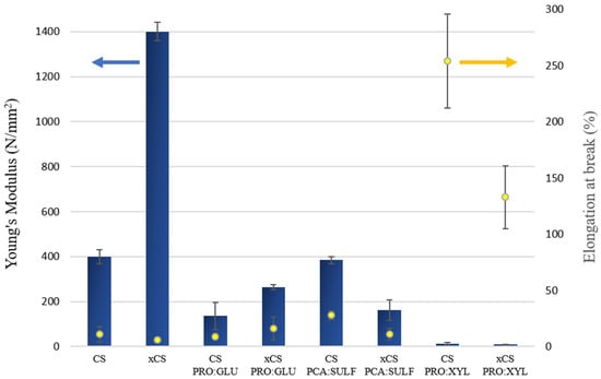 Mechanical properties of investigated membranes: Young’s Modulus (blue bars) and elongation at break (yellow dots).