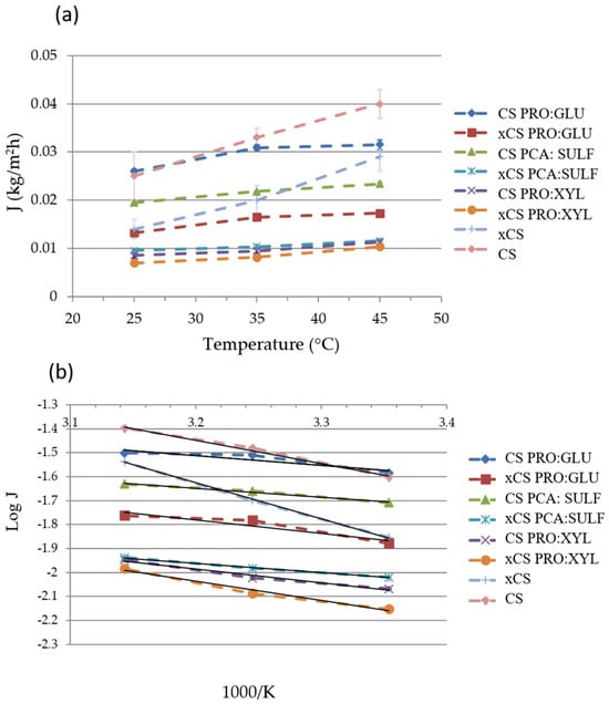 As expected, as the feed temperature was increased from 25 to 45 °C, the total permeate flux also increased. This trend could be related to the increase in thermal motion of the polymer chains at higher temperatures, which leads to the creation of more free volumes inside the membrane, fostering the passage of permeating molecules []. The plot of total flux as a function of the reciprocal of the absolute temperature shows a linear relationship, indicating an Arrhenius dependence of total flux and operating temperature (Figure 5b). The apparent activation energies (Ea), calculated from the slopes of the curves and by Equation (5), and shown in Table 2, show positive values very similar to these (except for the pristine CS membranes), indicating that the permeation flux increases with the temperature. For all the investigated membranes, the crosslinking with GA led to a decrease in the total flux, mainly ascribable to a free volume reduction []. The CS pristine membrane and the CS PRO:GLU membrane presented the highest total flux values (between 0.025 and 0.04 kg m−2 h−1), in comparison to all other investigated membranes. The flux trend could be related to the swelling measurement, as shown in Figure 6. These two membranes, in fact, were characterized by the highest swelling degree as an index of their propension to adsorb the permeating molecules present in the feed mixture. On the other hand, the lowest total flux value was found for the xCS PRO:XYL membrane (between 0.007 and 0.01 kg m−2 h−1), which could be related, also in this case, to its lowest swelling degree at the azeotropic point respect to the other membranes.