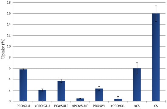 The PV results align with the solvent uptake measurements. As illustrated in Figure 6, the xCS PRO:XYL membrane exhibited one of the lowest solvent uptake values, while the less selective membranes (CS and CS PRO:GLU) showed some of the highest. Higher solvent uptake leads to greater membrane swelling, which increases free volume, resulting in higher flux but reduced selectivity.