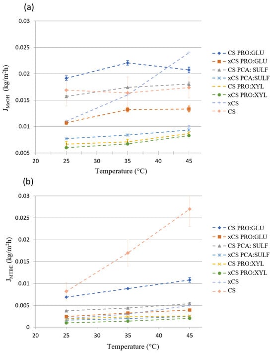 Figure 7a,b display the partial fluxes of MeOH and MTBE. Except for the CS membrane, the MeOH partial fluxes were always higher than the MTBE ones. The partial fluxes, both for MeOH and MTBE, increased as the feed temperature was increased. By looking at the values of Ea reported in Table 2, it is possible to observe that, in almost all cases, the values for MTBE were higher than the ones for MeOH, indicating that MTBE flux is more influenced by the temperature than MeOH. This could be ascribed to an enlargement of the polymer free volume with temperature, which promotes the passage of larger molecules such as MTBE [,].