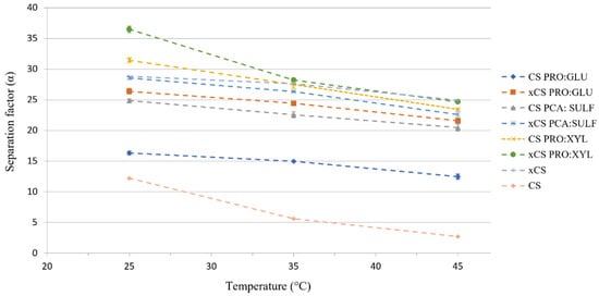 For all the membranes, the separation factor decreases when the temperature is increased. In line with the free volume theory, the temperature increase is accompanied with an increase in the thermal motion of the polymer chains in the amorphous regions, which results in the formation of wider free volumes more permeable to bigger molecules like MTBE []. The same effect explains the higher separation factor, which can be observed for the crosslinked membranes with respect to the non-crosslinked ones. The xCS PRO:XYL membrane was the more selective one, reaching a separation factor of 36.4 (at 25 °C), followed by the CS PRO:XYL membrane (α = 31.4 at 25 °C) and the xCS membrane (α = 28.8 at 25 °C). Pristine CS and CS PRO:GLU membranes were the less selective ones, in line with their higher total fluxes.