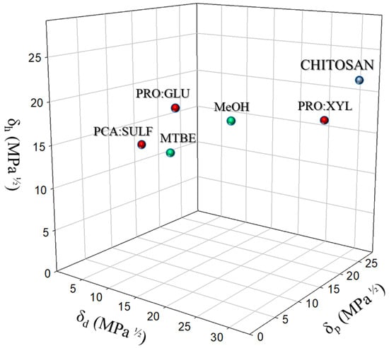 The compatibility of a polymer with a solvent can be analyzed using the Hansen solubility theory, following the principle of “like dissolves like”. According to the HSPs, polymers are soluble only in solvents with similar HSP values, considering dispersive (δd), polar (δp), and hydrogen-bonding (δh) forces. The HSP values of polymers and DESs were plotted on a three-dimensional space (Figure 9) in order to better visualize the affinity of the investigated DESs for the polymer and the target permeating species (MeOH and MTBE). The closer the HSPs of the polymer are to those of the solvent, the greater the expected solubility. As can be seen from Figure 9, CS exhibits high polar (δp) and hydrogen-bonding (δh) values, suggesting the possibility of strong interactions with polar solvents such as MeOH, which, in fact, is due to its proximity. Conversely, MTBE, being less polar than MeOH, lies further from the CS position, indicating weaker interactions with the chitosan matrix. This distance supports the experimental findings where MeOH is preferentially permeated over MTBE. Based on the positions of the various DESs evaluated, PRO:XYL and PRO:GLU are the closest to MeOH, indicating a strong affinity with the alcohol. However, PRO:GLU is also positioned near MTBE. This may explain the higher selectivity observed in the xCS PRO:XYL membrane, as PRO:XYL is close to MeOH and the furthest from MTBE. Additionally, the closer proximity of this DES to CS suggests a greater compatibility with the polymer, potentially leading to a denser and thus more selective membrane structure. The hypothesis is that PRO:XYL can effectively fine-tune the interaction between the membrane and MeOH, improving its selective separation.