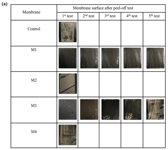 (a) Membrane surface after the peel-off tests for the control PVDF-CNT membrane and ECMs (b) physical stability of ECMs at different sonication elapsed times.