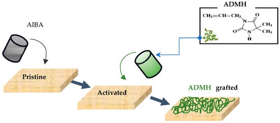 XLE-4040, a spiral-wound thin-film composite polyamide RO membrane, was obtained from Dow Chemical Company. Sodium bicarbonate, humic acid, potassium hydroxide (KOH), 5.5-dimethyl hydantoin (DMH), allyl bromide, methanol, initiator 2, 2-azobis (isobutyramidine) hydrochloride (AIBA), and glycerol were obtained from Sigma Aldrich (Pty) Ltd., Johannesburg, GP, South Africa. All chemicals were of analytical grade and used without further purification. Nutrient broth powder and nutrients were purchased from Lasec SA (Pty) Ltd., Cape Town, WC, South Africa. Deionized water with a conductivity of less than 5 μS cm−1, obtained from a Millipore water purification system in the lab, was used for solution preparation, membrane rinsing, and conservation.