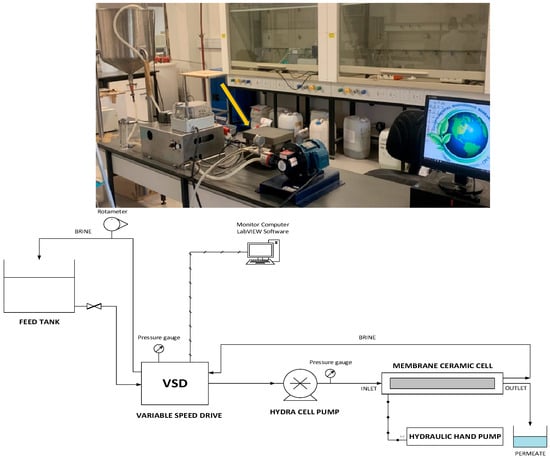 Photo (up) and process flow diagram (down) of the lab-scale flat-cell RO system.