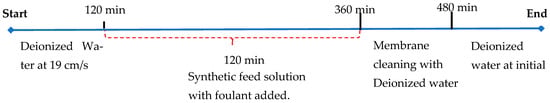 After the cell was secured, the feed solution was added, and the pump was switched on. The system was switched on, and the LabVIEW program was started to control the operating conditions. The flux was recorded every 30 min. Figure 3 illustrates the experimental timeline followed during the membrane performance and fouling evaluation tests, comprising the initial pure water flushing stage, the fouling phase, and the final pure water cleaning step used to assess flux recovery.