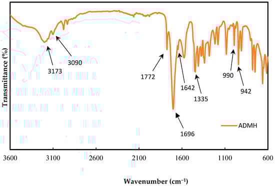 The ADMH was characterized by FTIR using the PerkinElmer FTIR spectrum, two spectrometers with a scan range of 400–4000 cm−1, to confirm the chemical’s purity. Figure 4 shows the FTIR results for ADMH after synthesis.