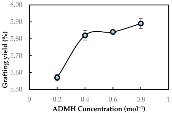 The degree of grafting was initially evaluated using the grafting yield. Figure 5 shows the grafting yields obtained with different ADMH concentrations. It is observed that the degree of grafting increases with the grafting concentration. This is due to the greater availability of monomer molecules at the membrane surface, which affects chain propagation during graft polymerization of the RO membrane. This implies a difference in the physiochemical properties of the modified membranes, as the properties of modified membranes are a function of grafting yield, which is highly dependent on the reaction conditions, like the concentration of the modifying agent [].
