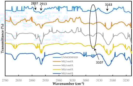 FTIR graphs for the unmodified, M0, M0.2mol/L, M0.4mol/L, M0.6mol/L, and M0.8mol/L (modified membranes with 0.2 mol L−1, 0.4 mol L−1, 0.6 mol. L−1, and 0.8 mol L−1, respectively) in the wavenumber range of 2780–3230 cm−1.