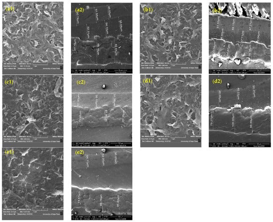 SEM images of the unmodified and ADMH-grafted membranes (top view and cross-section): (a1,a2) unmodified membrane, (b1,b2) 0.2 mol L−1 ADMH, (c1,c2) 0.4 mol L−1 ADMH, (d1,d2) 0.6 mol L−1 ADMH, (e1,e2) 0.8 mol L−1 ADMH.