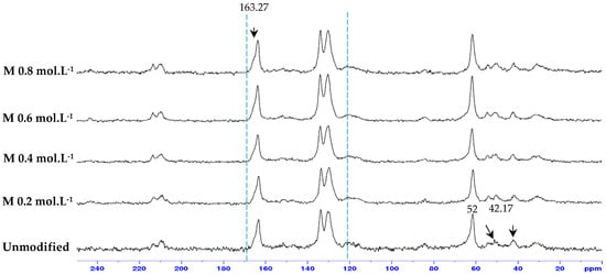 The carbonyl peak at 165 ppm belongs to the reverse osmosis membrane. Moreover, the chemical shift at 5.6–5.8 ppm was due to the methine proton in the pendant allyl groups. The spectrum of the neat bulk membrane displays resonances at 110 to 165 ppm, which belong to the reverse osmosis membrane. Liu et al. [] presented a nuclear magnetic resonance of ADMH and identified the elemental bonds of the agent. The pick-in at 52 ppm represents the (C (CH3)2) of the ADMH. The peak at 42.17 ppm corresponds to the (=CHCH2) bond in ADMH, which increases with increasing concentration. The pick at 130.4 ppm is (=CHCH2), while the pick at 163.27 ppm is the (C=O) bond in the ADMH structure. The variations observed from the membrane sample pick confirm successful graft polymerization [].