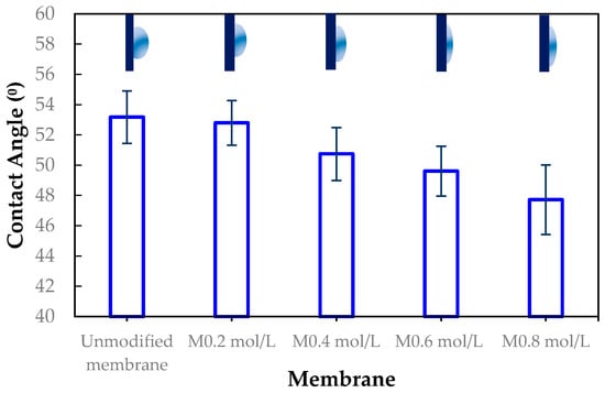 The membrane surfaces were characterized using advancing contact angle measurements to assess hydrophilicity. As shown in Figure 9, the contact angle decreased progressively with increasing ADMH concentration, from 53.17° ± 1.73° for the unmodified membrane to 47.72° ± 2.29° for the 0.8 mol/L-modified membrane, with intermediate values of 52.80° ± 1.48°, 50.74° ± 1.75°, and 49.61° ± 1.65° for 0.2, 0.4, and 0.6 mol/L modifications, respectively. This trend indicates that ADMH grafting effectively enhances surface hydrophilicity. The introduction of hydrophilic amine and hydroxyl groups increases surface polarity, promoting water affinity and thereby lowering the contact angle []. These findings align with previous reports indicating that the introduction of hydrophilic materials to the membrane surface reduces contact angles, thus improving membrane wettability [].