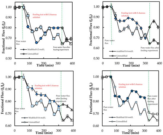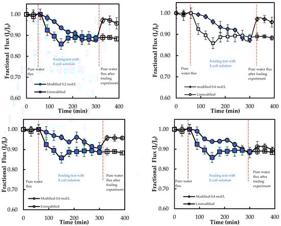 Moreover, the membrane M0.4 mol L−1 shows the highest improvement of 37.42% and appears to be the optimal modified membrane against E. coli. The success of the graft polymerization of ADMH is observed by the behavior of the 0.4 mol/L membranes. However, the membrane sample at 0.8 mol L−1 exhibited the lowest improvement, which could be due to the alteration of the membrane, resulting in a reduction of electrostatic interactions necessary for an effective biofouling-resistant surface []. The improved biofouling resistance activity observed at moderate ADMH concentrations (0.2–0.4 mol L−1) can be attributed to adequate surface coverage that maintains the accessibility of active groups while preserving permeability and electrostatic repulsion. At higher concentrations (>0.6 mol L−1), however, excessive polymer deposition may cover functional groups, increase hydrogen bonding interactions, and hinder water transport []. Furthermore, it is observed that although surface hydrophilicity increases with ADMH concentration, antibiofouling performance peaks at 0.4 mol·L−1 and declines at 0.8 mol·L−1. This suggests that enhanced hydrophilicity alone is not decisive; at moderate concentrations, the denser hydrophilic groups promote a stable hydration layer that resists adhesion, whereas excessive concentrations cause surface heterogeneity, amplifying hydrophilicity but creating sites that facilitate microbial attachment and stronger foulant interactions []. The flux trend decreases over time, as shown in Figure 11, confirming the presence of microbial fouling, which is responsible for the decline in flux. The modified membranes exhibited higher fluxes than the unmodified ones, likely due to improvements in surface properties resulting from ADMH grafting. The anti-biofouling properties of ADMH are attributed to the strong bond formed on the membrane surface, which affects the flux of the membranes [].