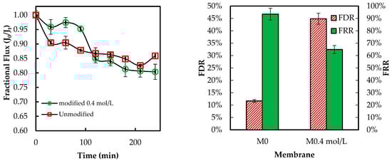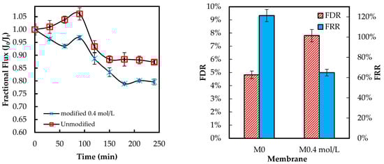 The antifouling ability of the membrane was evaluated in terms of flux decline ratio (FDR) and flux recovery ratio (FRR), as shown by Equations (3) and (4) []: