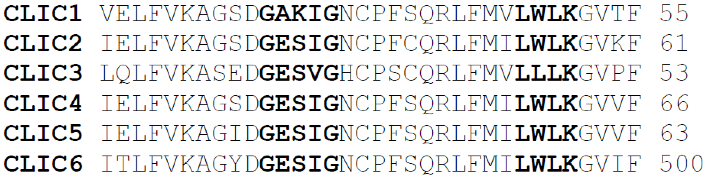 - Singh, H.; Ashley, R.H. CLIC4 (p64H1) and its putative transmembrane domain form poorly selective, redox-regulated ion channels. Mol. Membr. Biol. 2007, 24, 41–52. [Google Scholar] [CrossRef] [PubMed]