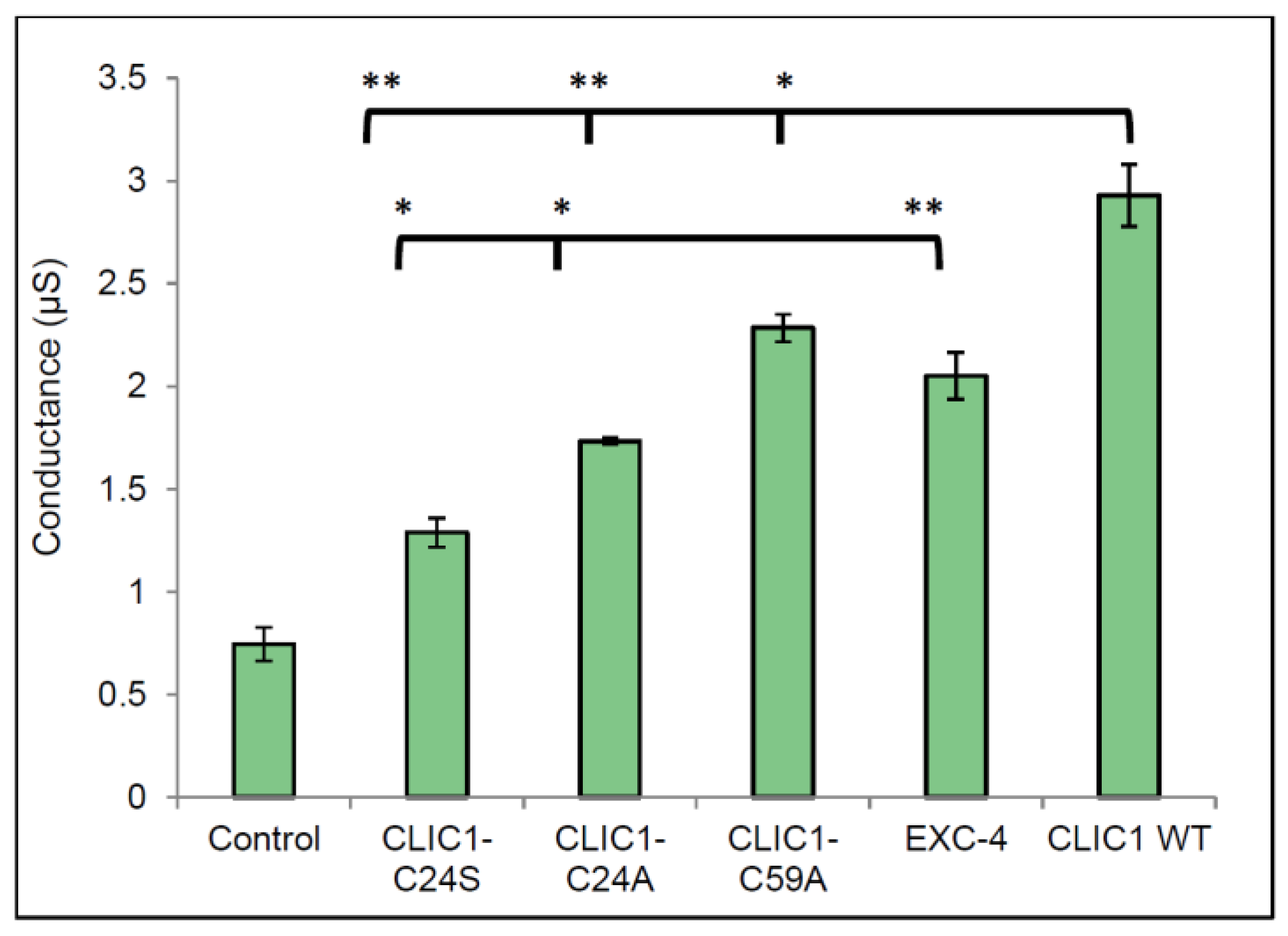 CLIC1 contains a total of six cysteine residues, with Cys24 and Cys59 known to form an intramolecular disulphide bridge upon oxidation of the protein. CLIC1 is also the only member of the CLIC family to contain Cys59. Experiments measuring the conductance of CLIC1 mutants (CLIC1-C24A and CLIC1-C59A) were performed to determine the role of redox in CLIC1 activity. In addition, the CLIC-like protein EXC-4 was also used and compared to wild type CLIC1. In Figure 4, all proteins assessed, including the three CLIC mutants and EXC-4 were more conductive in membranes containing cholesterol, compared to the control (25 mol % cholesterol in membrane, with no protein added). Statistical analysis comparing conductance of CLIC1 wild type monomer to all CLIC1 mutants revealed a significant difference in the conductance of the tested proteins as indicated by one way ANOVA test with a p value of <0.0001. Further statistical analyses were performed using the Tukey’s multiple comparisons statistical test. This revealed no significant difference in conductance between the two CLIC1 mutants CLIC1-C24A and CLIC1-C24S. Similarly, CLIC1 wild type monomer and EXC-4 conductance values were not significantly different as assessed by Student t-test.