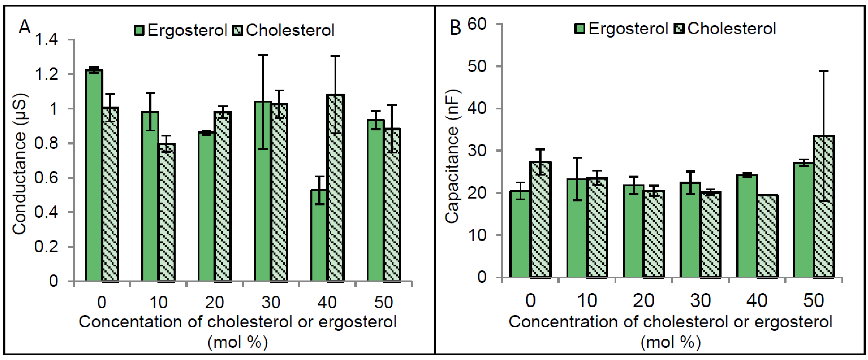 Conductance and capacitance of membranes containing different concentrations of cholesterol or ergosterol. Bilayer lipid membranes were formed using 10% tethered lipids on a gold electrode representing the monolayer of membrane and zwitterionic lipids dissolved in ethanol containing different concentrations of cholesterol or ergosterol was used as the second layer for the membrane. Membranes were then rapidly flushed with HEPES/KCl buffer (pH 6.5) in order to remove the ethanol by solvent exchange method and enhance the formation of the bilayer lipid membranes. The conductance and the capacitance of membranes were measured using impedance spectroscopy. (A) Represents membrane conductance at different cholesterol or ergosterol concentrations and (B) Capacitance of membrane with different cholesterol or ergosterol concentrations. The error bars represent the standard error of three independent impedance spectroscopy conductance measurements.