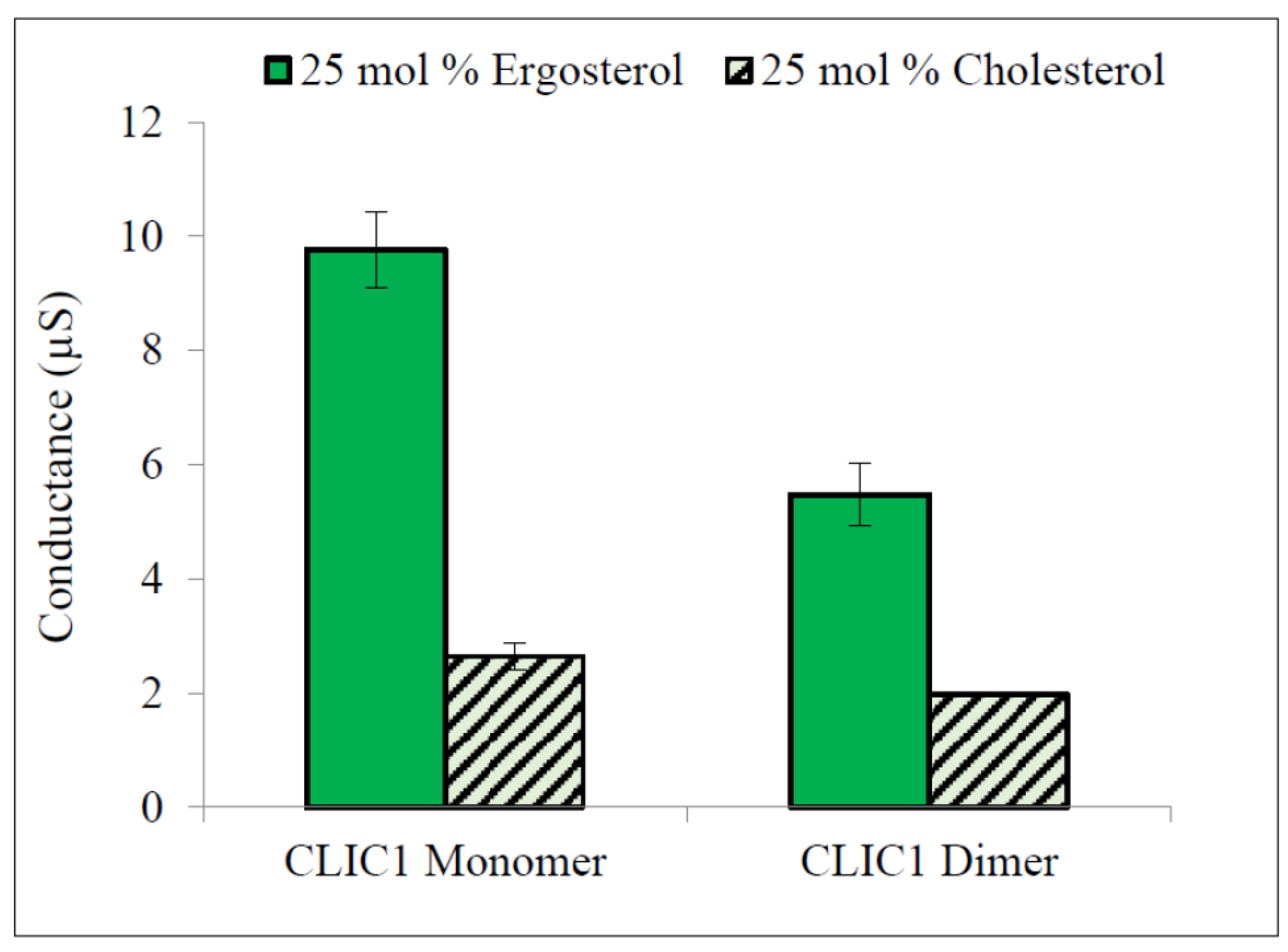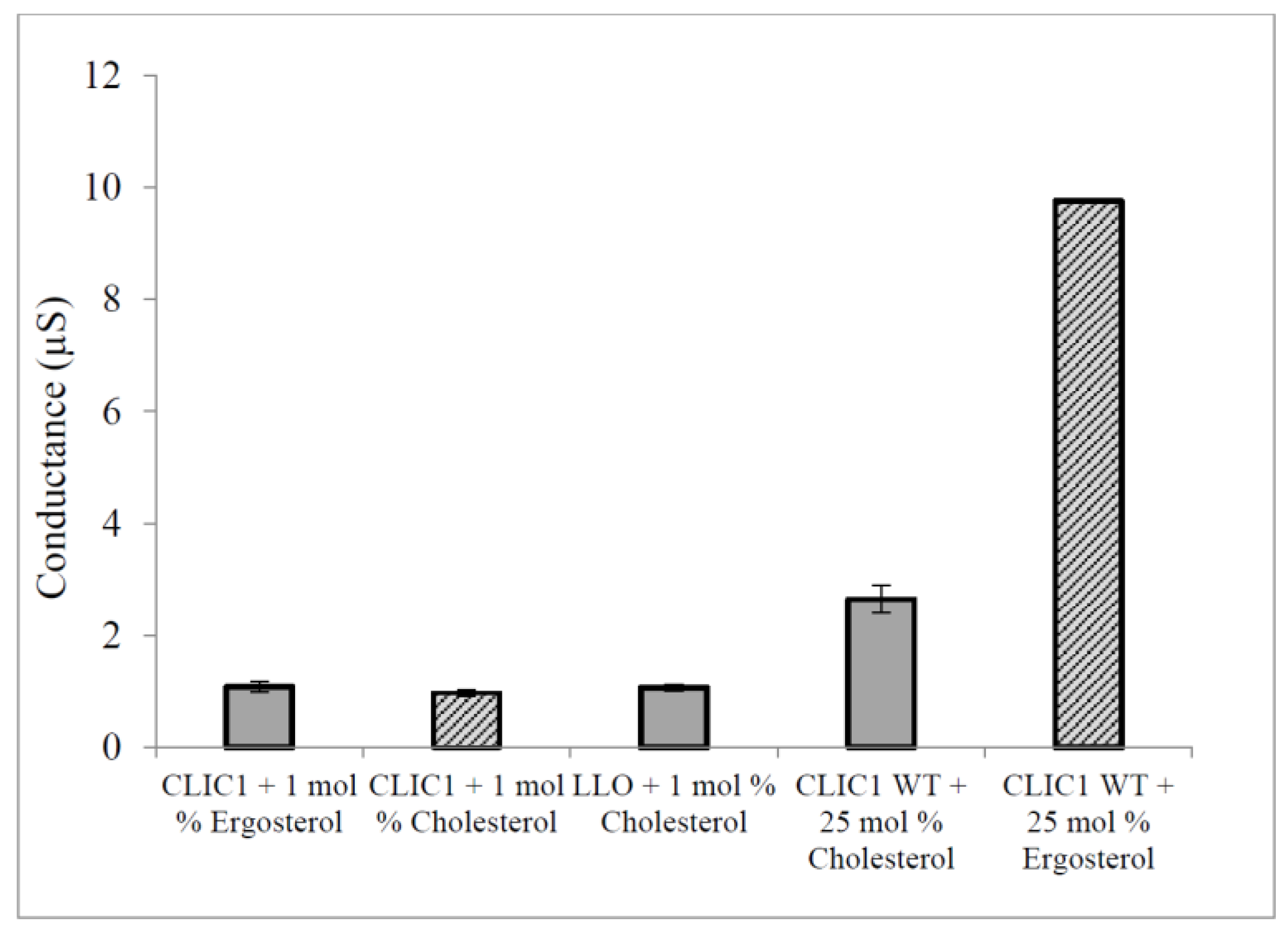 Conduction of pre-incubated CLIC1 monomer with sterols in tBLMs containing 50 mol % cholesterol or ergosterol. CLIC1 (WT) monomeric protein (20 µg in 100 µL of HEPES/KCl buffer, pH 6.5) was incubated with 1% cholesterol or 1% ergosterol for ~1 h prior addition to tethered bilayer lipid membranes containing 25 mol % cholesterol or ergosterol. Conductance of pre-incubated CLIC1 monomer with sterols was then measured with impedance spectroscopy and compared to Controls: CLIC1 monomer not pre-incubated with sterols added into membranes containing 1% of cholesterol or ergosterol, listeriolysin-O (20 µg of LLO in 100 µL of HEPES/KCl buffer, pH 6.5) was also incubated with 1% cholesterol under the same conditions as CLIC1 monomer followed by addition to membranes with 50 mol % cholesterol. The error bars represent the standard error of three repeats of experimental measures (n = 3).