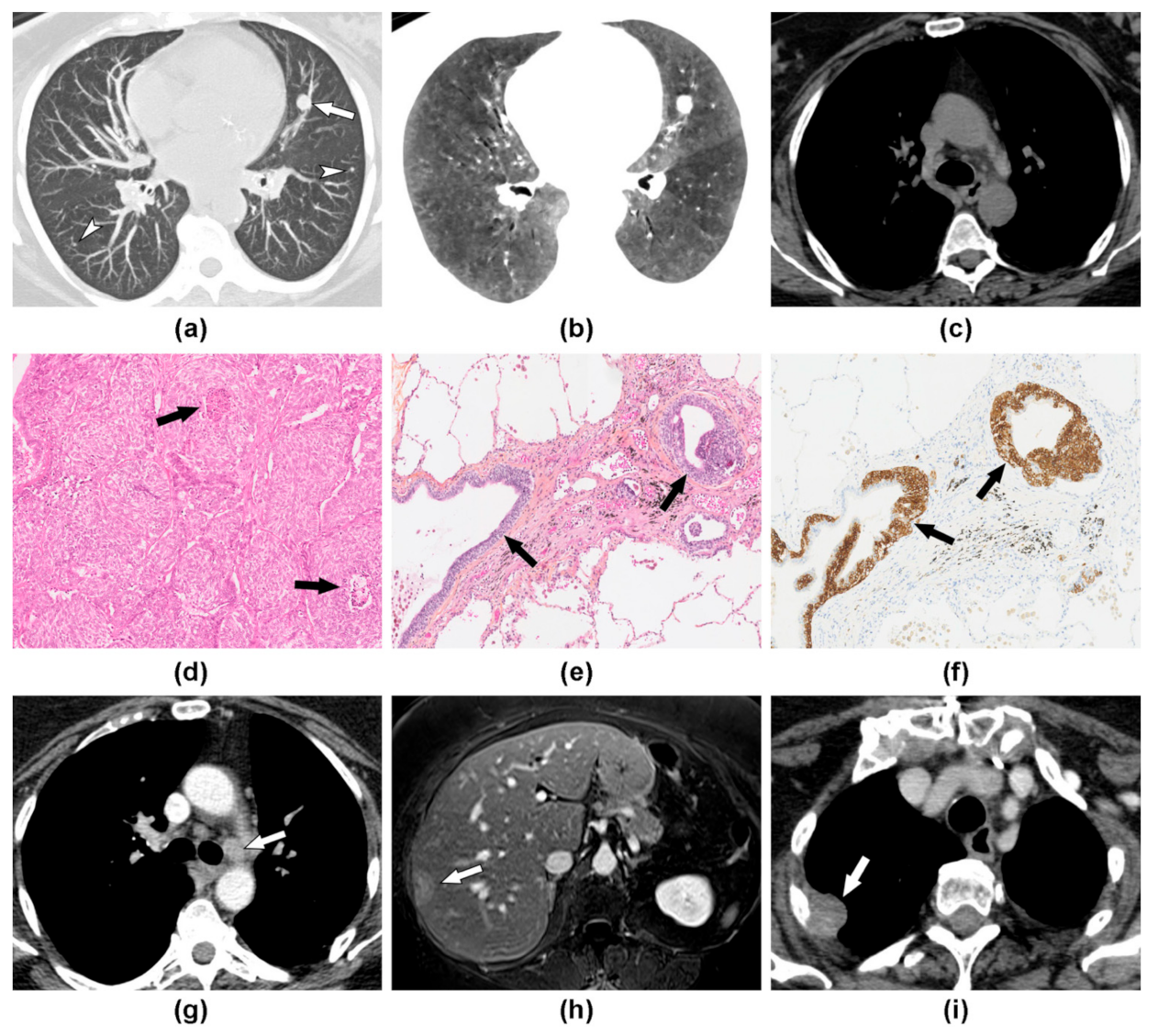 - Chassagnon, G.; Favelle, O.; Marchand-Adam, S.; De Muret, A.; Revel, M.P. DIPNECH: When to Suggest This Diagnosis on CT. Clin. Radiol. 2015, 70, 317–325. [Google Scholar] [CrossRef]