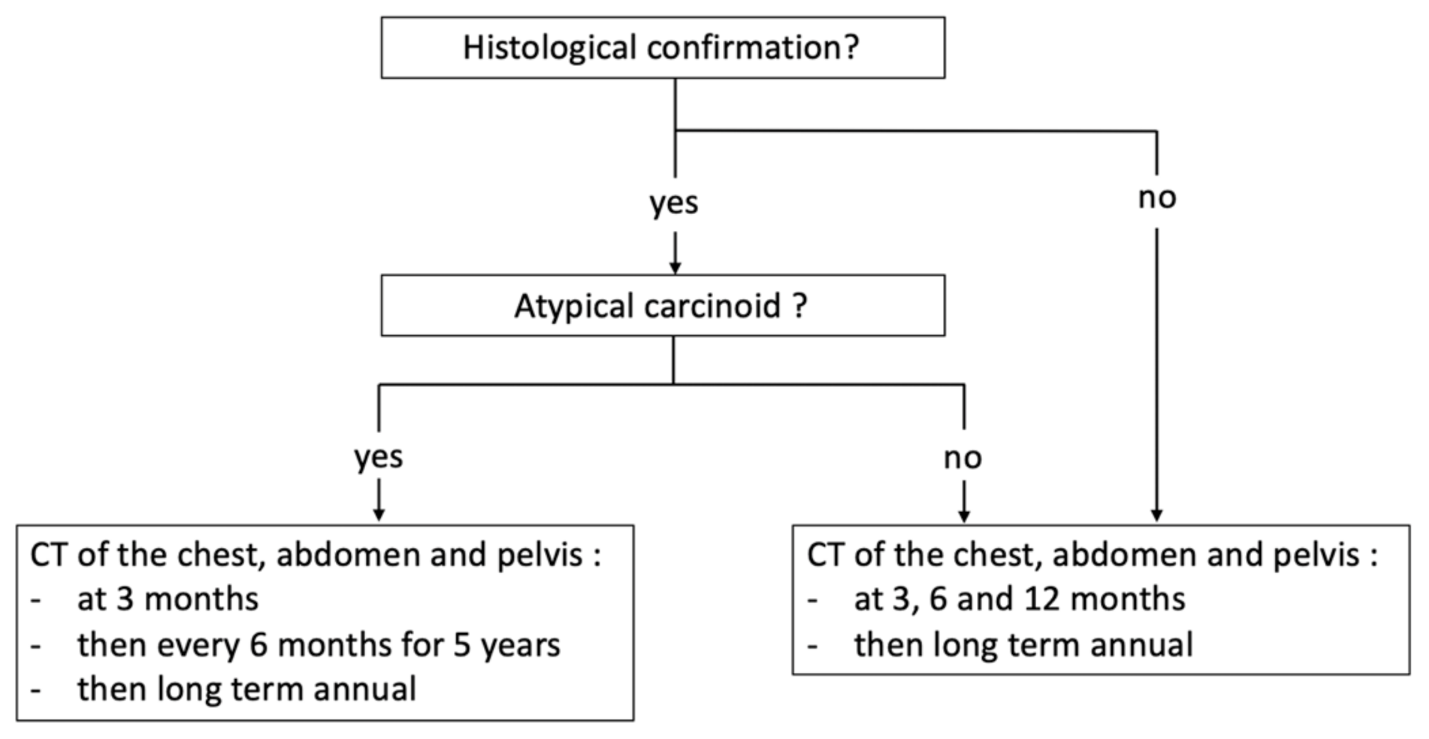 - Caplin, M.E.; Baudin, E.; Ferolla, P.; Filosso, P.; Garcia-Yuste, M.; Lim, E.; Oberg, K.; Pelosi, G.; Perren, A.; Rossi, R.E.; et al. Pulmonary Neuroendocrine (Carcinoid) Tumors: European Neuroendocrine Tumor Society Expert Consensus and Recommendations for Best Practice for Typical and Atypical Pulmonary Carcinoids. Ann. Oncol. 2015, 26, 1604–1620. [Google Scholar] [CrossRef] [PubMed]