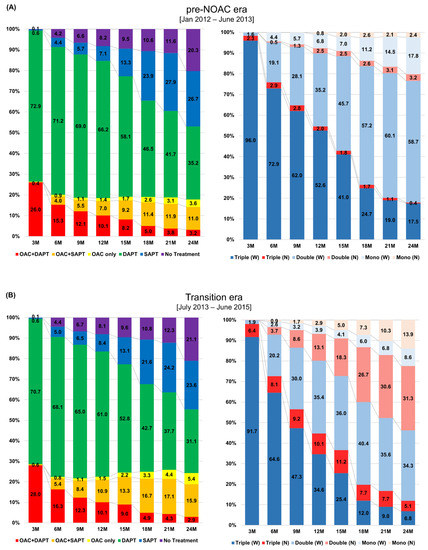 Clinical data of the study population were obtained from the claims database of the Korean Health Insurance Review and Assessment Service (HIRA). The HIRA includes comprehensive details regarding complete medical healthcare utilization and cost data from primary care health services, pharmacies, and hospitals that cater to the entire Korean population [6]. The original database can be accessed via request through the Healthcare Bigdata Hub (https://opendata.hira.or.kr (accessed on 1 June 2020)) of the HIRA. From the database, we included patients with AF who underwent PCI between 2012 and 2016. Patients with AF were defined based on the International Classification of Diseases, Tenth Revision, Clinical Modification (ICD-10-CM) codes I48.0–48.4 and I48.9, excluding those with mitral stenosis (I50, I52, and I59) or prosthetic heart valves (Z952–Z954). Among patients with AF, we identified those who underwent PCI after the diagnosis of AF using the procedure codes for coronary intervention: M6551–6552, M6561–6564, and M6571–6572. We excluded patients who died before discharge and those for whom follow-up medication records were unavailable. Finally, we analyzed the data of 18,691 patients. NOACs were introduced in Korea in 2013 and have been widely used only since July 2015 after the expansion of the reimbursement criteria was adopted in Korea [4]. Therefore, we categorized the study population into the following cohorts based on the period of study inclusion: the pre-NOAC era (January 2012–June 2013), the transition era (July 2013–June 2015), and the NOAC era (July 2015–December 2016). The study was approved by the Seoul National University Hospital Institutional Review Board (E-1911-052-1078). Informed consent was waived by the review board as each patient is de-identified and encrypted in the HIRA database to protect patient privacy.