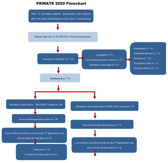In total, 112 patients were evaluated for eligibility. A total of 37 were excluded from the sample because they did not meet the inclusion criteria, and 75 (from 18 to 66 years old) were included in the trial, with 38 being allocated and receiving the intervention in the R group and 37 being allocated and receiving the intervention in the PTN group. Eight patients (four from each group) were lost, because they did not show up for the second appointment (consequently, they did not return the pain diary), even after the researchers attempted to contact them by text message and phone call. Therefore, 34 patients were analyzed in the R group, and 33 patients were analyzed in the PTN group. The PRIRATE 2020 flow diagram shows the number of patients included in the clinical trial (Figure 1). Table 1 describes patient and tooth-related factors for the two groups: rotary (PTN) and reciprocating (R). There were no statistic significant differences between groups for the time of instrumentation (p = 0.536) and intake of analgesics (p = 0.988) (Table 1).