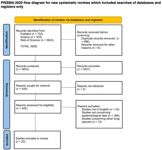 In this study, we performed a review of the literature concerning tinea gladiatorum incidence according to the PRISMA guidelines []. Three electronic databases (“PubMed”, “Scopus”, and “Web of Science”) were searched on 20 June 2022 for articles of any type published since 1992. The following medical subject heading (MeSH) terms were used: “tinea gladiatorum” OR “fungal infection” OR “dermatophyte” OR “dermatophytosis” OR “tinea corporis” OR “contact sports” OR “Trichophyton tonsurans” AND “wrestler(s)”. After the first search, we gathered 6859 articles. Later on, after removing duplicated articles, we obtained 5853 papers. After the first screening, we found 426 records; however, after a precise review of titles and abstracts and assessment of eligibility (during which all articles that were non-English or not concerning sufficient epidemiological data or concerning other fungi species were excluded immediately from the study), we extracted a total number of 22 elements which were included in our review. The PRISMA flow diagram was constructed (Figure 1). All initially searched articles were imported to Zotero 5.0, AGPL license.