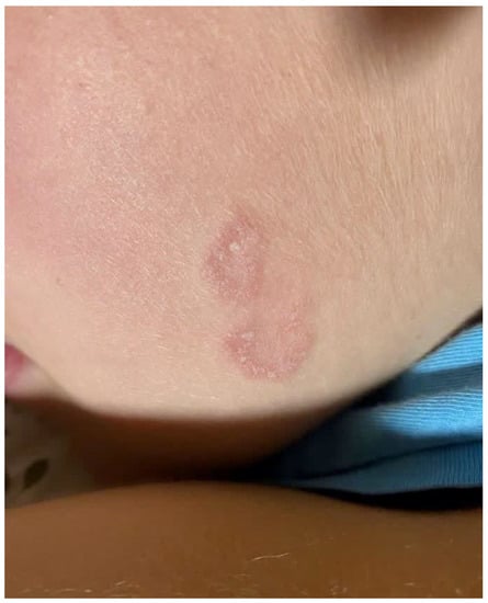 Lesions on the surface of the trunk can be described as well-defined and annular scaling papules and/or plaques with raised borders, mild erythema, and a clear center. Lesions may vary in size, usually ranging from 1 to 5 cm, but larger lesions can also occur. They can be single as well as multiple [,,,,]. Three clinical types are distinguished: tinea circinata type, eczema marginatum type, and plaque-like type []. Early lesions might be difficult to differentiate from atopic dermatitis, psoriasis, early herpes gladiatorum, or acneiform papules. Additionally, sometimes they heal spontaneously, leaving the patient unaware of remaining a pathogen transmitter [,,].