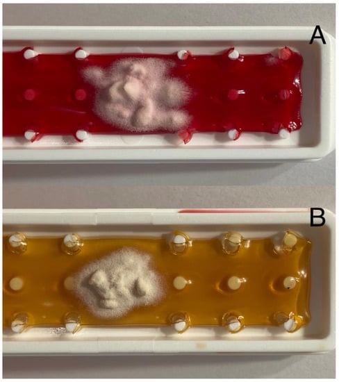 Tracing epidemics is one of the most important tasks and challenges of public health and modern epidemiology. Moreover, helping to determine the source of infection may be crucial in restricting the spread of the pathogen []. A classical procedure of dermatophyte identification is growing a culture on a specific medium such as Sabouraud dextrose agar. One of the agar plates should also contain cycloheximide to prevent bacteria and non-dermatophyte mold contamination [] (Figure 3 and Figure 4).