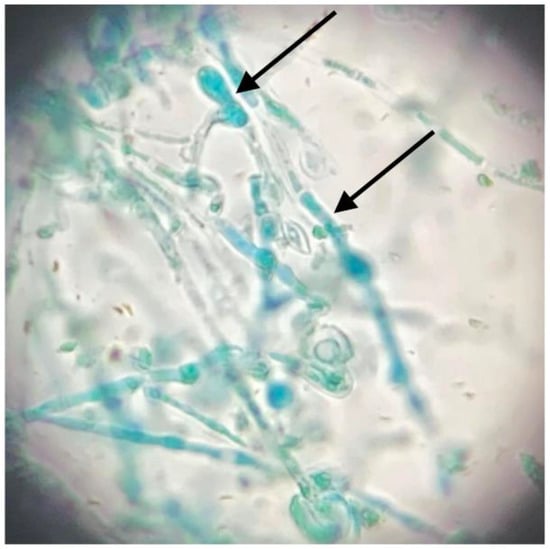 Microscopic picture of microculture: numerous microconidia, including club-shaped ones (pointed by black arrows). Courtesy of Prof. J. C. Szepietowski.