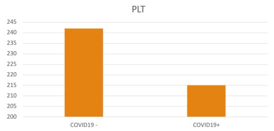 Platelet level in patients without and with SARS-CoV-2 infection at entrance to the Emergency Department. The value indicated for platelets (PLT) is ×109/L. The mean platelet counts were different between the two groups (242.1 ± 92.1 in COVID-19 negative vs. 215.2 ± 82.8 in COVID-19 patients, p < 0.001).